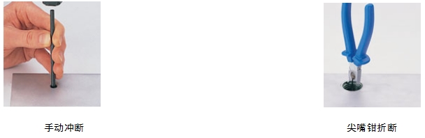 手動(dòng)沖斷鋼絲螺套安裝柄時(shí),將手動(dòng)沖斷器對(duì)準(zhǔn)安裝柄,用200g左右的榔頭猛打一下即可去除,對(duì)于18×2.5以上的粗牙鋼絲螺套和14×1.25以上的細(xì)牙鋼絲螺套,用尖嘴鉗上下彎曲亦能將安裝柄去除,還有助于防止跳牙,見下圖。