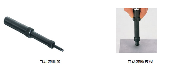 當(dāng)鋼絲螺套安裝完成時(shí),將自動(dòng)沖斷器沖頭端插入已裝有鋼絲螺套的內(nèi)螺紋孔中,用手握住自動(dòng)沖斷器的施力部分,向下施加軸向力,當(dāng)聽到“咔嚓”的聲音時(shí),表示鋼絲螺套的安裝柄已被沖斷,見下圖。